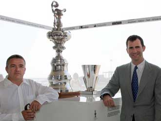 ©ACM 2006/Photo: Jorge Andreu. Valencia, 23 06 2006. Valencia Louis Vuitton Act 12. Spaniens kronprins Felipe och Michel Bonnefous, President för organisatören av America's Cup med pokalerna The America's Cup och Louis Vuitton Cup.