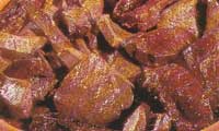 Hacka löken och vitlöksklyftorna och fräs dem i lite olivolja tills de blir mjuka. Tillsätt den strimlade levern, hackad persija och stek några minuter till. Krydda med salt, peppar och ett par teskedar paprikapulver. Tillsätt 3 – 4 matskedar sojasås och stek färdigt under omrörning.